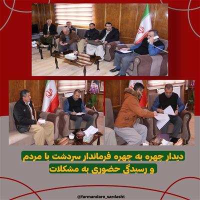 فرماندار سردشت صبح امروز در ادامه برنامه های ملاقات عمومی به صورت حضوری، مسائل و مشکلات مطرح شده شهروندان را مورد بررسی و پیگیری قرار داد.