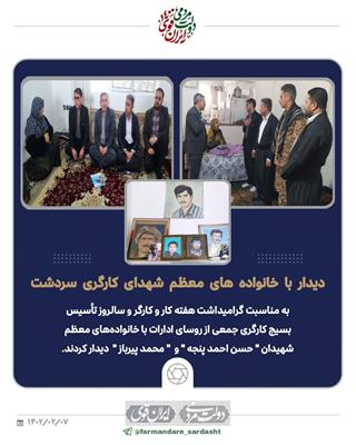 به مناسبت گرامیداشت هفته کار و کارگر و سالروز تأسیس بسیج کارگری جمعی از روسای ادارات با خانوادههای معظم شهیدان " حسن احمد پنجه " و " محمد پیرباز " دیدار کردند.