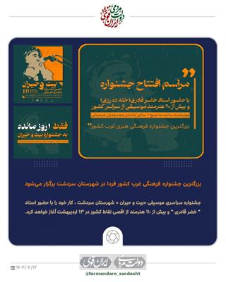 جشنواره سراسری موسیقی «بیت و حیران » شهرستان سردشت ، کار خود را با حضور استاد " خضر قادری " و بیش از 110 هنرمند از اقصی نقاط کشور در 13 اردیبهشت آغاز خواهد کرد.