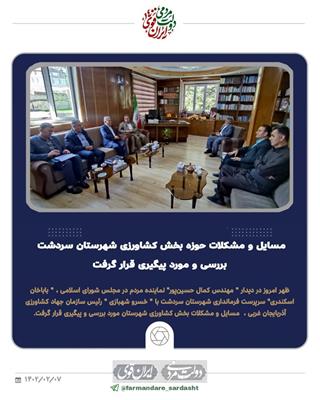 ظهر امروز در دیدار نماینده مردم در مجلس شورای اسلامی ، " باباخان اسکندری" سرپرست فرمانداری شهرستان سردشت با رئیس سازمان جهاد کشاورزی آذربایجان غربی ، مسایل و مشکلات بخش کشاورزی شهرستان مورد بررسی و پیگیری قرار گرفت.