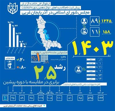 پیش ثبت نام کاندیداهای دوازدهمین دوره انتخابات مجلس شورای اسلامی در آذربایجان غربی در یک نگاه به صورت اینفو گرافیکی تهیه و تدوین شده است.