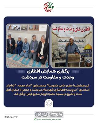 این همایش با حضور حاجی ماموستا " محمد واوی " امام جمعه ، " باباخان اسکندری " سرپرست فرمانداری شهرستان سردشت و جمعی از علمای اهل سنت و تشیع در مسجد حضرت ابوبکر صدیق (رض) برگزار شد.