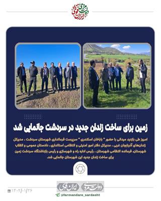 امروز طی بازدید میدانی با حضور " باباخان اسکندری " سرپرست فرمانداری شهرستان سردشت ، " مراد فتحی " مدیرکل زندانهای آذربایجان غربی ، مدیرکل دفتر امور امنیتی و انتظامی استانداری و دادستان عمومی و انقلاب شهرستان زمین برای ساخت زندان جدید این شهرستان جانمایی شد.