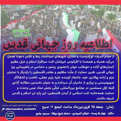 راهپیمایی روز جهانی قدس در شهرستان سردشت همزمان با سراسر کشور فردا صبح راس ساعت 11 برگزار می شود.