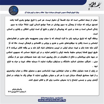 شورای فرهنگ عمومی شهرستان سردشت دربارۀ عفاف و حجاب و اهمیت و لزوم رعایت آن بیانیه ای صادر کرد.