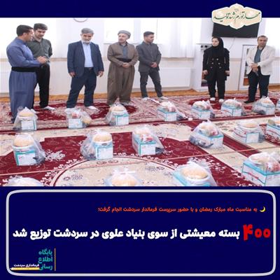 به مناسبت ماه مبارک رمضان و با حضور " باباخان اسکندری " سرپرست فرمانداری سردشت 400 بسته معیشتی از سوی بنیاد علوی به ارزش کلی یک میلیارد و 500 میلیون ریال در بین خانواده های نیازمند سطح شهرستان توزیع گردید.
