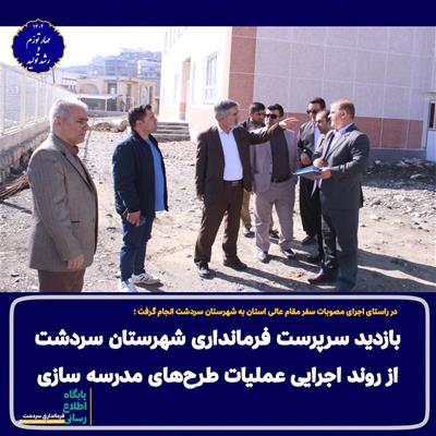 صبح امروز " باباخان اسکندری" سرپرست فرماندار سردشت به همراه " اسکندر علیزاده" سرپرست اداره آموزش و پرورش شهرستان از روند اجرایی عملیات طرحهای مدرسه سازی بازدید به عمل آورد.