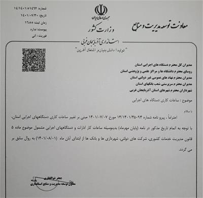براساس اعلام معاونت توسعه مدیریت و منابع استانداری آذربایجانغربی ساعات کار ادارات و دستگاه های اجرایی، شرکت های دولتی، شهرداری ها و بانک ها از ابتدای آبان ماه به روال سابق بر می گردد.