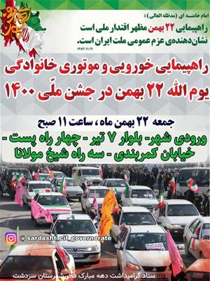 | از مردم انقلابی و همیشه در صحنه شهرستان سردشت دعوت میشود جهت شرکت در راهپیمایی 22 بهمن امسال بصورت خودرویی و رژه موتوری تزئین به پرچم مقدس جمهوری اسلامی ایران و تصاویر امامین انقلاب اسلامی، چهل و سومین جشن سالگرد شکوهمند انقلاب اسلامی ایران را با صلابت و پرشور به به نمایش بگذارند.