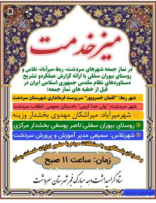 بمناسبت گرامیداشت ایام الله دهه مبارک فجر میز خدمت در شهرهای ربط،سردشت، میرآباد،نلاس و روستای بیوران سفلی برگزار می شود.