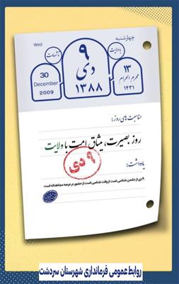 حماسه ای که در نهم دی ماه 1388 رقم خورد برگ زرین دیگری بر کتاب قطور انقلاب افزود و در تقویم ایران اسلامی روز "بصیرت و میثاق با ولایت" نام گرفت تا یادمان این روز، تجلی گر آگاهی، اقتدار، غیرت، بصیرت و هوشمندی امتی مؤمن باشد که محاسبات دشمنان را به هم ریخت و آنان را مأیوس کرد.