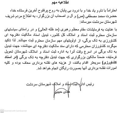 روابط عمومی اداره ثبت اسناد و املاک شهرستان سردشت طی انتشار اطلاعیه ای از کشاورزان خواست تا جهت تبدیل سند دفترچه ای به تک برگی خود هرچه سریعتر اقدام کنند.