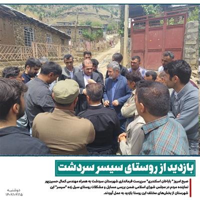 صبح امروز " باباخان اسکندری" سرپرست فرمانداری شهرستان سردشت و مهندس کمال حسینپور نماینده مردم شهرستانهای پیرانشهر، سردشت و میرآباد در مجلس شورای اسلامی به همراه بخشدار بخش ربط از روستای سیل زده "سیسر" این شهرستان بازدید و ضمن بررسی مسائل و مشکلات ناشی از سیل، با امام جماعت، دهیار، شورای اسلامی و جمعی از معتمدین این روستا دیدار و گفتگو کرد.