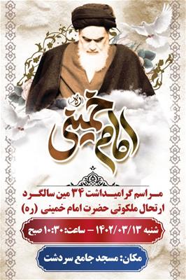 مراسم گرامیداشت سی و چهارمین سالگرد ارتحال ملکوتی حضرت امام خمینی (ره) روز شنبه در مسجد جامع سردشت برگزار می شود.